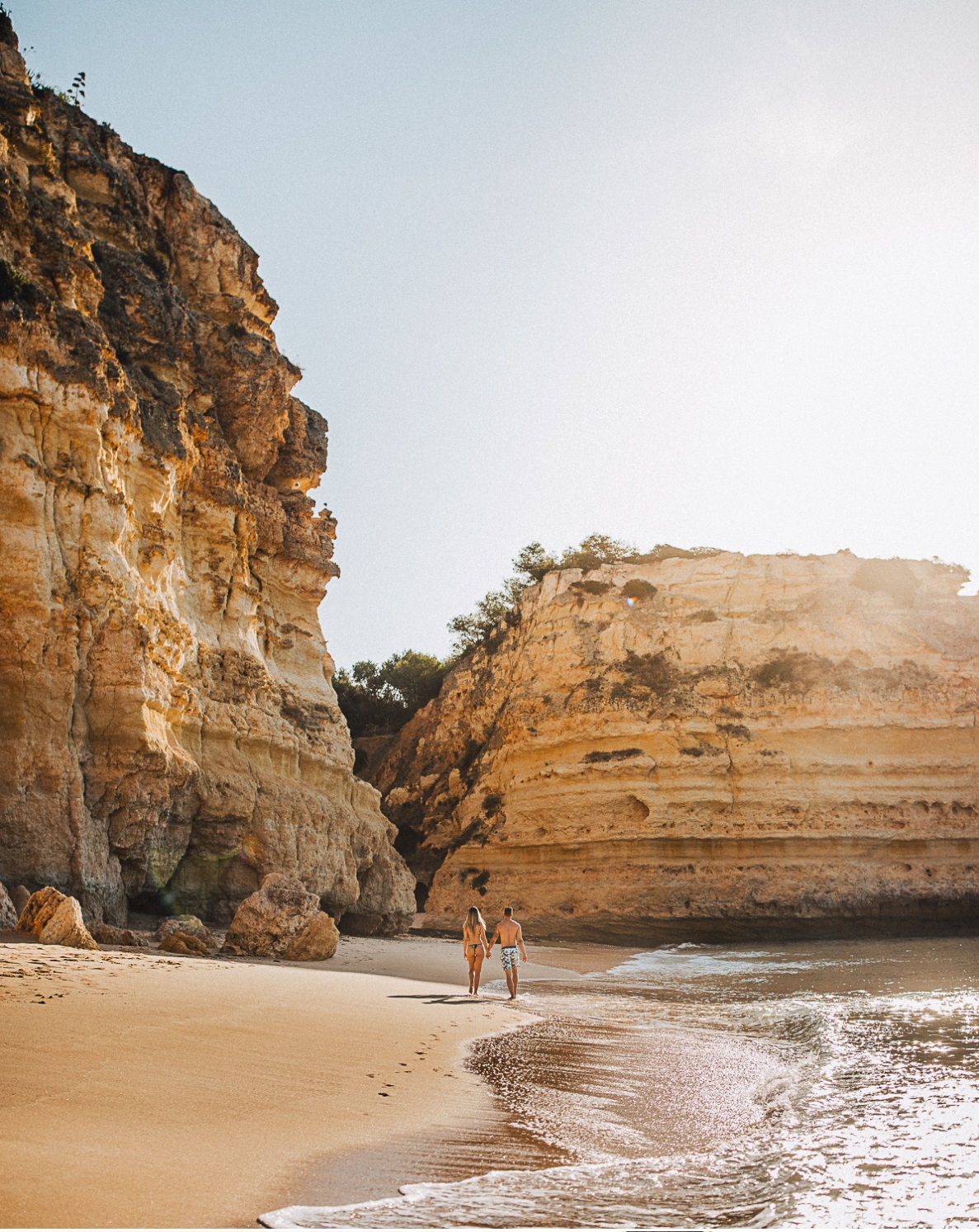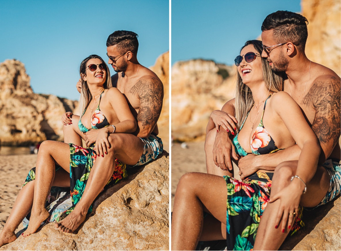 Saímos de Lisboa junto com a nossa parceira de vídeo Mireia Llum, e pegamos estrada rumo ao Algarve, as 4:30 da manhã e as 8:00 nos encontramos com eles no primeiro local do ensaio , que foi na Praia da Marinha, situada da região de Lagos, no Algarve. Essa praia é considerada uma das 10 praias mais bonitas da Europa e entre as 100 do mundo. Escolhemos esse horário bem cedo para aproveitar que tem menos pessoas e ficar exclusiva para nós, e aproveitar a hora que a luz do sol fica mágica. Não deu outra, a união de um casal apaixonado, uma luz da manhã perfeita, a areia da praia e as falésias existentes no local, resultou em fotos fantásticas.